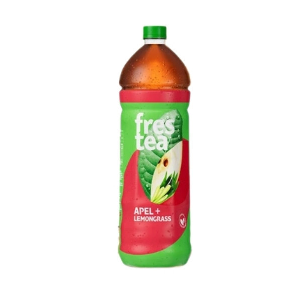 Minuman teh rasa apel dalam kemasan, manis, segar, dengan aroma buah yang ringan.