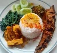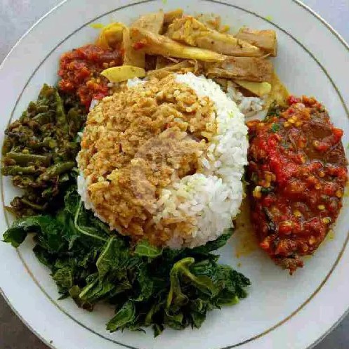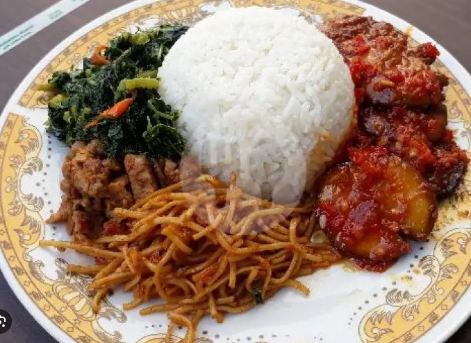 Seporsi nasi dengan ayam goreng berbumbu rempah yang gurih, ditambah pilihan sayur khas dan sambal untuk pelengkap.