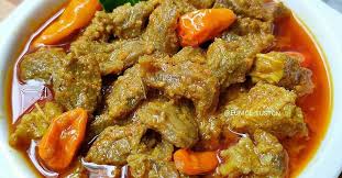 Potongan daging sapi dimasak dalam kuah gulai santan berbumbu rempah khas Padang, rasanya gurih, pedas, dan dagingnya empuk.