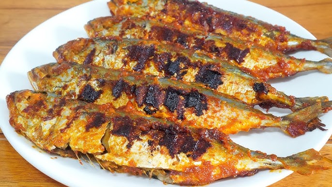 Ikan kembung dibumbui rempah lalu dibakar hingga harum, rasanya gurih dengan sedikit manis-pedas dan aroma bakaran khas.