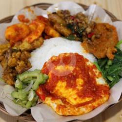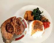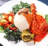 Seporsi nasi dengan ayam goreng berbumbu rempah yang gurih, ditambah pilihan sayur khas dan sambal untuk pelengkap.