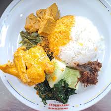 Seporsi nasi dengan ayam gulai berkuah santan berbumbu rempah, dilengkapi sayur khas dan sambal untuk rasa gurih dan sedikit pedas.